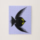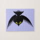 This awesome puzzle Halloween design features a cartoon style image of a crow. The crow is black with yellow eyes and has its wings outstretched. The background is blue.