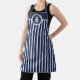 © 2021 Socialite Designs Inc. Elegant and classic navy blue and white striped apron with a crowned cake design. Around the cake design are curved text elements that can be customised. Please contact Socialite Designs if you need assistance with the text.