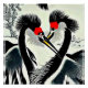A.I .created print of Two Crowned Cranes with prominent red crests face each other, forming a heart shape with their beaks and necks in a winter landscape.
