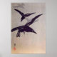 Whimsical "Crows Flying in Snow" by Ito Sozan (1884 - ?) dated in the early 1920s was published by Watanabe Shozaburo. The original print is much smaller than a normal print of its day, the being but 6 5/8 inches wide by 9 7/8 inches tall. This beautiful and somewhat fanciful print shows skilfully executed "bokashi"((ぼかし), Japanese for "shading off" or gradation shading) to the distant crows and grey sky. The wood grain is also visible in the sky and overall it is a nicely detailed carving and a striking wintertime image of crows flying in a snowstorm.