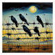 A.I .created print of a group of crows perch on barbed wire fencing, set against a radiant sunset resulting in a psychedelic sky above a polychromatic landscape.