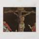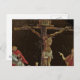 Iconic image depicting Jesus on the cross with saints at either side. The painting is a centerpiece from a panel painting. Painted by German artists Niclaus of Hagenau and Matthias Grunewald in 1512.