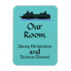 This customisable cruising flexible magnet template has a cruise ship image in black. It says Our Room. There are two sample names.