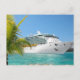 Postcard shown with a photo print of a cruise ship in the tropics.