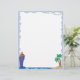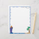 This vacation letterhead features light blue border, an island with palm trees in the bottom right corner, and a big blue cruise ship in the bottom left corner.