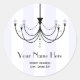 An address label sticker featuring a background of light blue and white vertical stripes. Illustration of crystal chandelier hanging from top centre. Personalise the black text under illustration with your name and address. Look for matching items such as postage and invitations at Jill's Paperie.