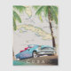 Illustrated map of Cuba (plus surrounding islands) in a beautiful vintage detailed style with a classic old cuban car in the sunset.