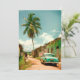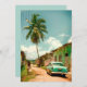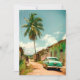 Lovely retro photograph from a sandy street in the country side of Cuba. Summer day with large palm tree, Cuban woman and an American oldtimer car.