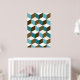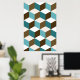 Optical illusion of shapes creating the pattern of cubes in teals, browns and white.