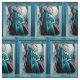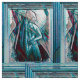 An artwork features a semi abstract woman with a shawl / veil in blue, white, and pink tones.
