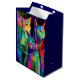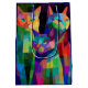 This striking illustration captures the quiet intensity of three upright cats, rendered in a bold cubist style that feels both retro and refreshingly modern. Their forms are constructed from layered rectangles and sharp polygons, giving each figure a geometric rhythm that draws the eye and invites closer inspection. Set against a dark, moody background, the cats glow in vibrant hues of orange, blue, and green—colors that pop with confidence and personality.