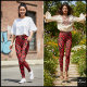 A woman in trendy black and red abstract leggings, showcasing the modern cubic interference design for a chic look.