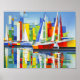 cubist painting of colourful sailboats docked in a harbour. Bold geometric patterns and bright reflections create a lively maritime atmosphere.