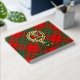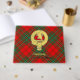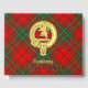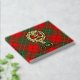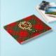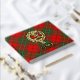 Clan Cumming crest badge surrounded by a strap and buckle over tartan background. Custom front, back and spine text.