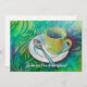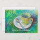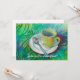 This invitation features a cup and spoon against a cool analogous coloured background.