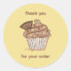 Yummy Fairy Cake sticker design to thank your customer for an order, a chocolate cake with frosting and sprinkled with star decorations on a creamy lemon background. The wording can be altered by following the prompt.
