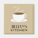 A kitchen magnet featuring an illustration of a hot cup of coffee on a saucer. Personalise with your name. Look for matching items at Jill's Paperie.