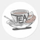 An illustration of a teacup on a china saucer, with a cooker or biscuit and a teaspoon. A picture for tea lovers, drawn in a retro style with halftones.