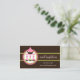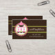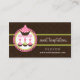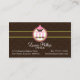 © 2012 Socialite Designs. Whimsical cupcake on a stand and three cake pops inside a lace circle business card design. The background has a chocolate and cocoa damask pattern. A perfect business card for a bakery business or event catering business such as dessert tables. Personalise this bakery business card with your information.