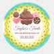 © 2021 Socialite Designs. Elegant desserts bakery sticker design incorporating a turquoise damask pattern background, yellow scalloped border banner for your text, and a mixture of desserts with a cupcake, cake pops and cookies inside a circle.