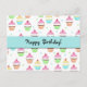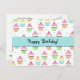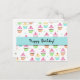 This is a great postcard to mail out for a birthday. It features a background covered with little cupcakes. A graphic of a blue ribbon runs through the centre with the words happy birthday. The text on the front and back are customisable.