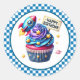 Round sticker is shown with a cute cupcake birthday space rocket print.