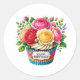 Round sticker is shown with a cute cupcake birthday flowers print.