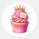 Round sticker is shown with a cute cupcake birthday princess crown print.