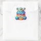 Round sticker is shown with a cute cupcake birthday blue monster print.