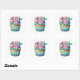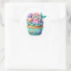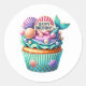 Round sticker is shown with a cute cupcake birthday mermaid print.