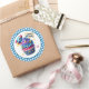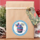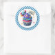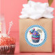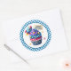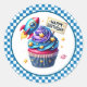 Round sticker is shown with a cute cupcake birthday space rocket print.