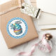 Round sticker is shown with a cute cupcake birthday robot print.