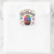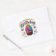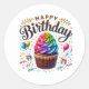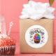 Round sticker is shown with a cute cupcake birthday print.