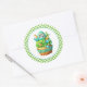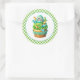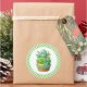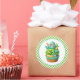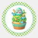 Round sticker is shown with a cute cupcake birthday dino print.