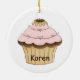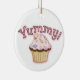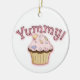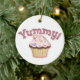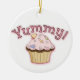 Colourful Christmas ornament, with whimsical graphics of pretty cupcakes, on the front and back, with pink graphic text, on the front, reading Yummy. Customise the brown text, on the back, to say anything you want. Great for anyone who loves sweets.