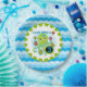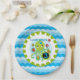Cupcake Octopus 3rd birthday party paper plates features a green and blue smiling octopus holding birthday cupcakes and balloons, text that reads Look Who's 3, and a wide background border of blue ocean waves! These cute octopus 3rd birthday paper plates are perfect for the birthday party whether a big celebration or a small get together!