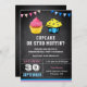 Amaze your guests with this cute gender reveal invite featuring a pink cupcake and a blue muffin with modern typography against a chalkboard background. Simply add your event details on this easy-to-use template to make it a one-of-a-kind invitation.