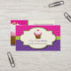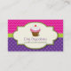 This bright and whimsical cupcake business card is sure to get attention. The cream coloured frame holds the chocolate cherry-topped cupcake with pink and white frosting and a business name and description. It sits against a colourful pink chevron and purple polka dot background. The reverse reveals the cupcake close up next to a cream panel containing the business information. Available in alternate colours with matching products.