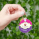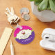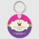 This bright and whimsical cupcake keychain is sure to get attention. The cream coloured frame holds the chocolate cherry-topped cupcake with pink and white frosting and a business name and description. It sits against a colourful pink chevron and purple polka dot background. Add main contact information below. Great for promotional use. Available in alternate colours with matching products.