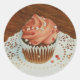 Chocolate cupcake with pink frosting and heart shaped sprinkles on a paper doily in brown and red tones.