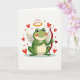 This Valentine’s Day greeting card features an adorable frog dressed as Cupid, centered on a bright white background. The frog is green with a creamy belly, big shiny eyes, and a wide smile, with soft pink blush on its cheeks that adds extra charm. Small white feather wings rest on its back, and a golden halo floats just above its head. In its hands, the frog holds a deep red bow and a matching arrow, ready to send love in your direction. Red hearts in different sizes float around the frog, filling the space with affection ❤️💌. There is no text on the front, letting the illustration share the message on its own. It’s a sweet, cheerful card that works beautifully for Valentine’s Day, romance, or a kind note to someone you care about