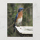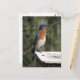 Postcard design features a photograph of a male Eastern Bluebird on top of his nest box.