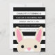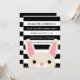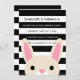 Super cute birthday party invitation with broad black and white stripes and a curious bunny.
