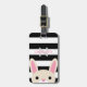Adorable luggage tag with broad black and white stripes. Your name in pink and your initial in silver grey. And a curious bunny peering at you.