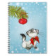 A funny and cute notebook with a christmas theme. A mischievous and playful white siamese cat. She is looking up at a christmas tree decoration hanging from a pine branch wondering if she should be naughty and play with it or not. Set on a blue background with white snowflakes.