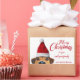Cute Merry Christmas animal illustration: Curious dog wearing a Santa hat. Seasonal holiday greeting written in modern typography letters.