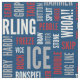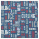 Fabric featuring a pattern of curling terms in shades of red, white and grey on blue background. Perfect for curlers and curling fans.