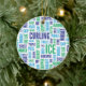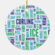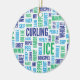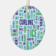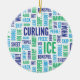 Ornament featuring a pattern of curling terms in shades of blue and green on white background. Perfect for curlers and curling fans.