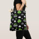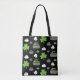 Tote bag featuring a shamrock and curling rock pattern in green, white and grey on black background. Perfect for curlers and curling fans.