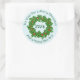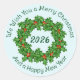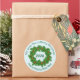 Curved text Christmas envelope seal. Round, white sticker with three custom text areas in dark green printed font. A holly and berry wreath in the centre with a place for the year date.